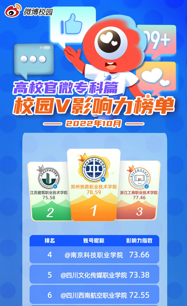 “微博校园”定期组织发布全国职业院校官方微博阶段排名,排行榜对全国职业院校官方微博的内容吸引力、传播影响力和主动活跃度等指标进行综合评估计算,得出总分,是目前在全国高校官方微博中影响力较大的综合评价体系。