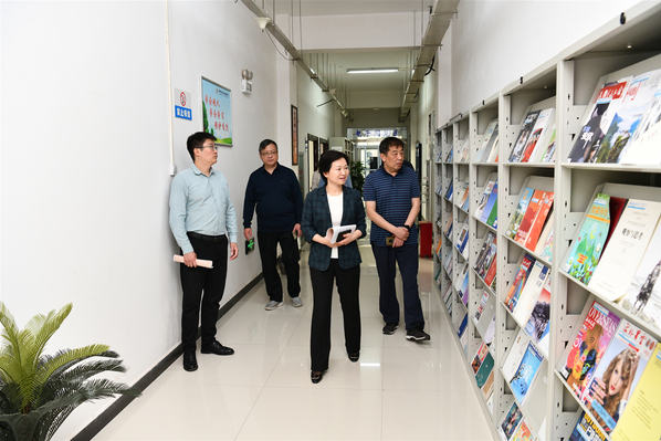 在图书馆调研期间,马玉霞深入各个书库、阅览室,详细了解图书馆现有功能布局、电子和纸质图书资源建设情况,听取了图书馆新馆建设进展、空间设计、功能布局、设施设备、智慧化建设等工作汇报。