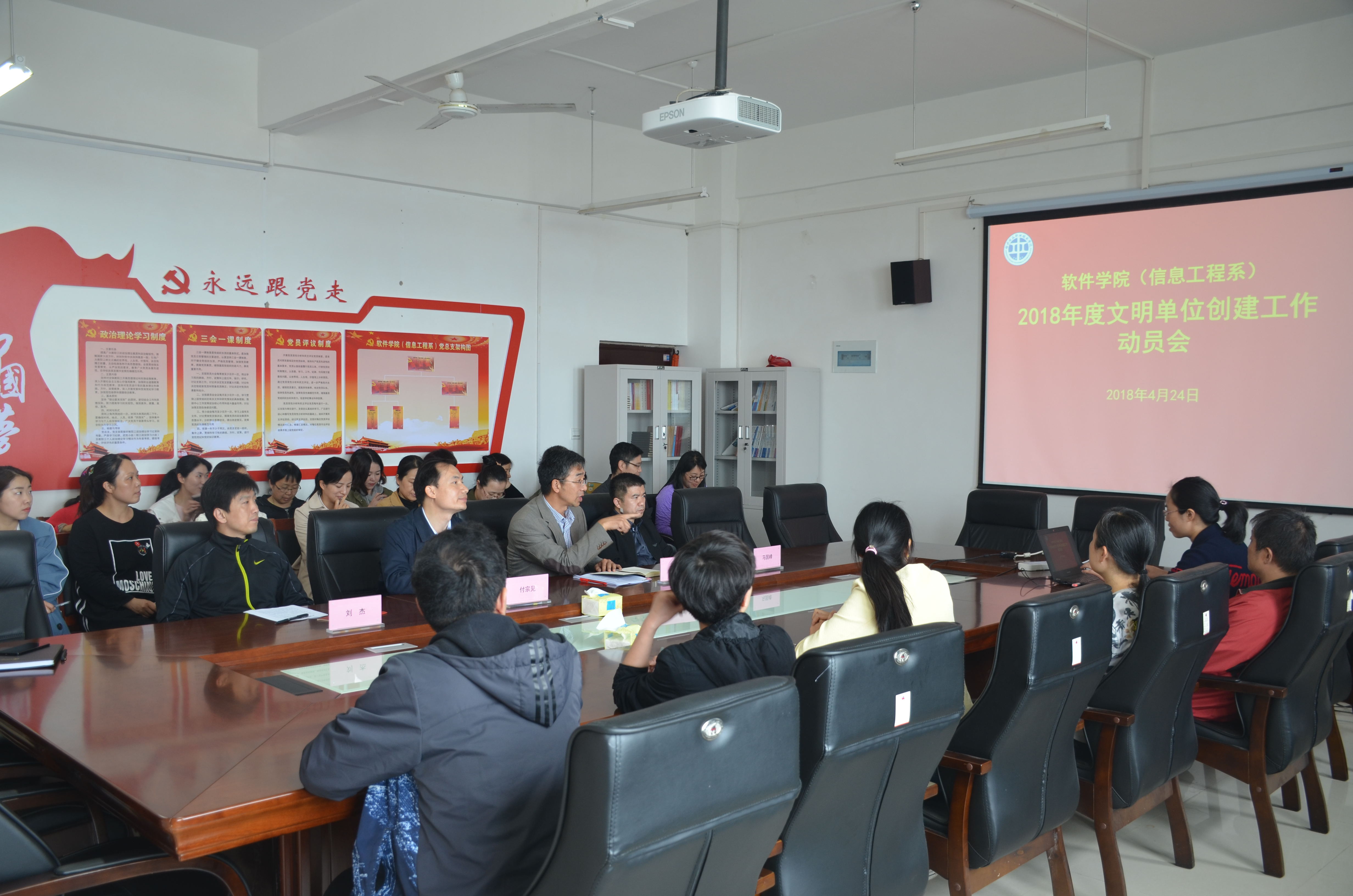 4月24日,软件学院(信息工程系)在会议室召开文明单位创建工作动员会。全系教师参加会议,软件学院党总支书记付宗见主持会议。