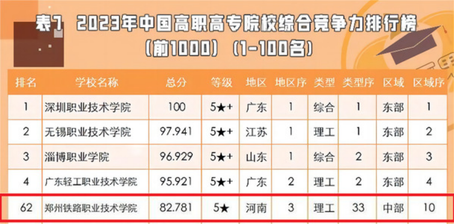 | 62 | Zhengzhou Railway Vocational & Technical College (ZZRVTC) | 82.781 | 5★ | Henan | 3 | Science & Engineering | 33 | Central China | 10 |