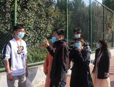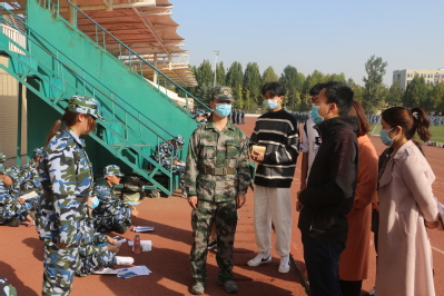 2020年10月21日上午9:00,医学技术与工程学院党总支副书记丁宁、学工办主任毛朋涛、组织员郭冬霞、辅导员张睿、20级全体代班到操场慰问军训中的新生们。