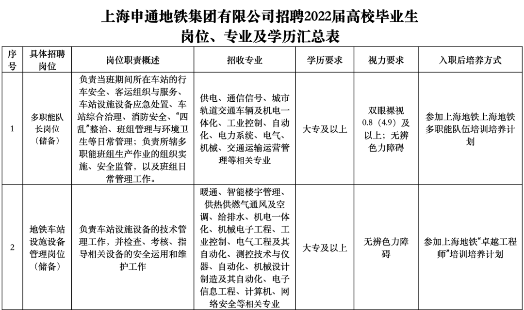 为适应超大规模轨道交通网络运营的人才需求,上海申通地铁集团有限公司下属各运营公司、磁浮公司面向2022届高校毕业生开展招聘,具体事项如下:
